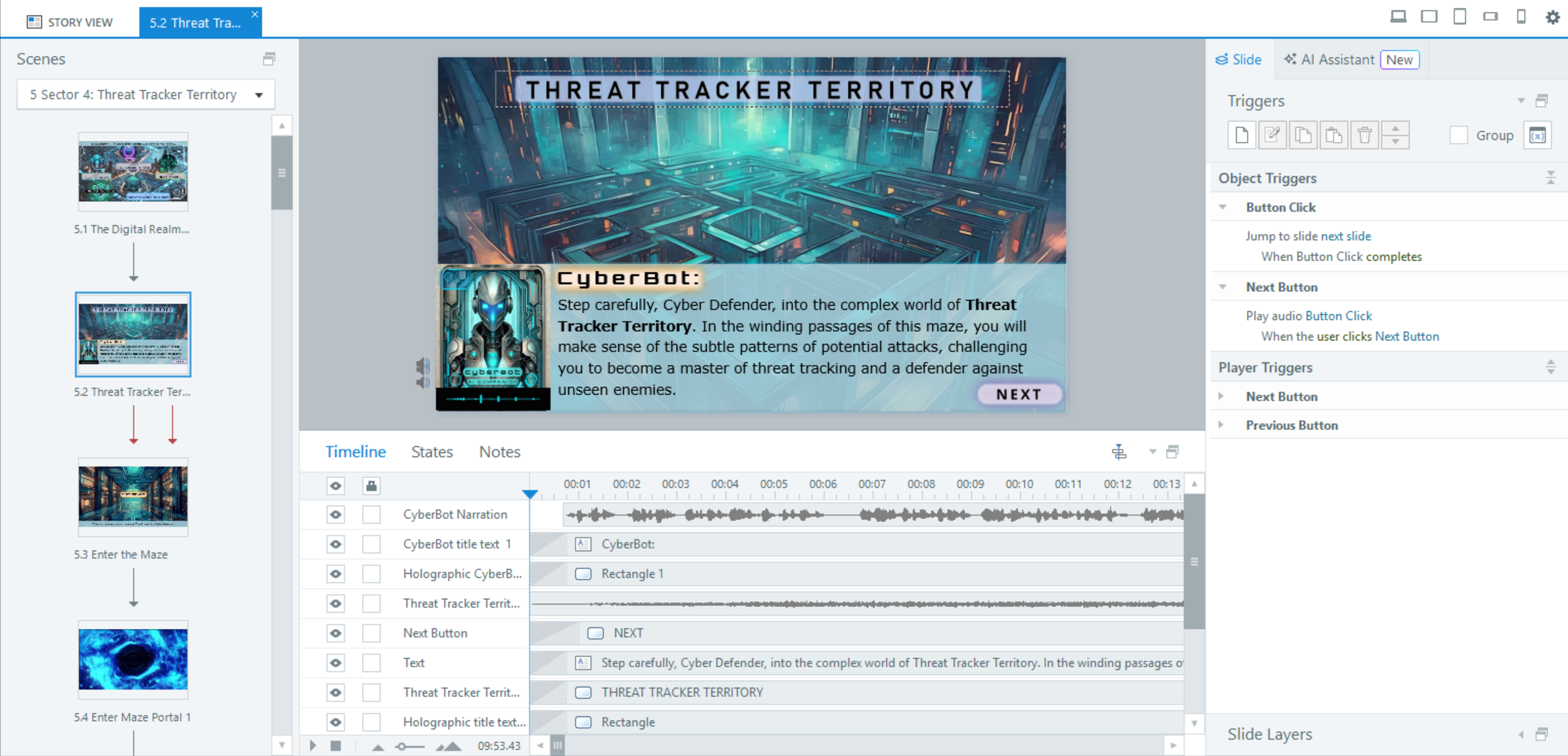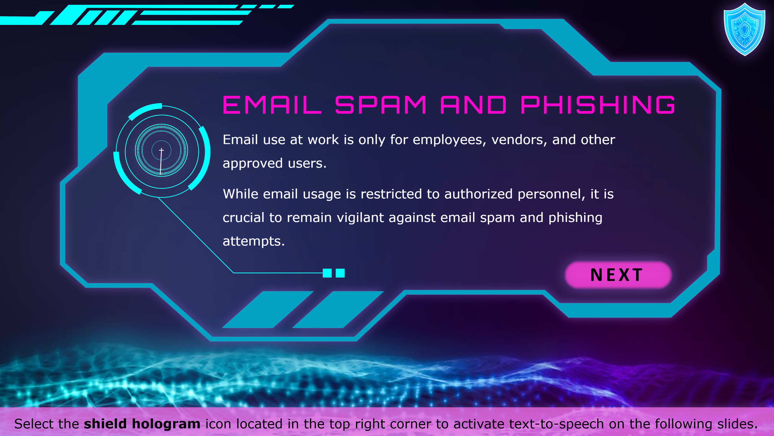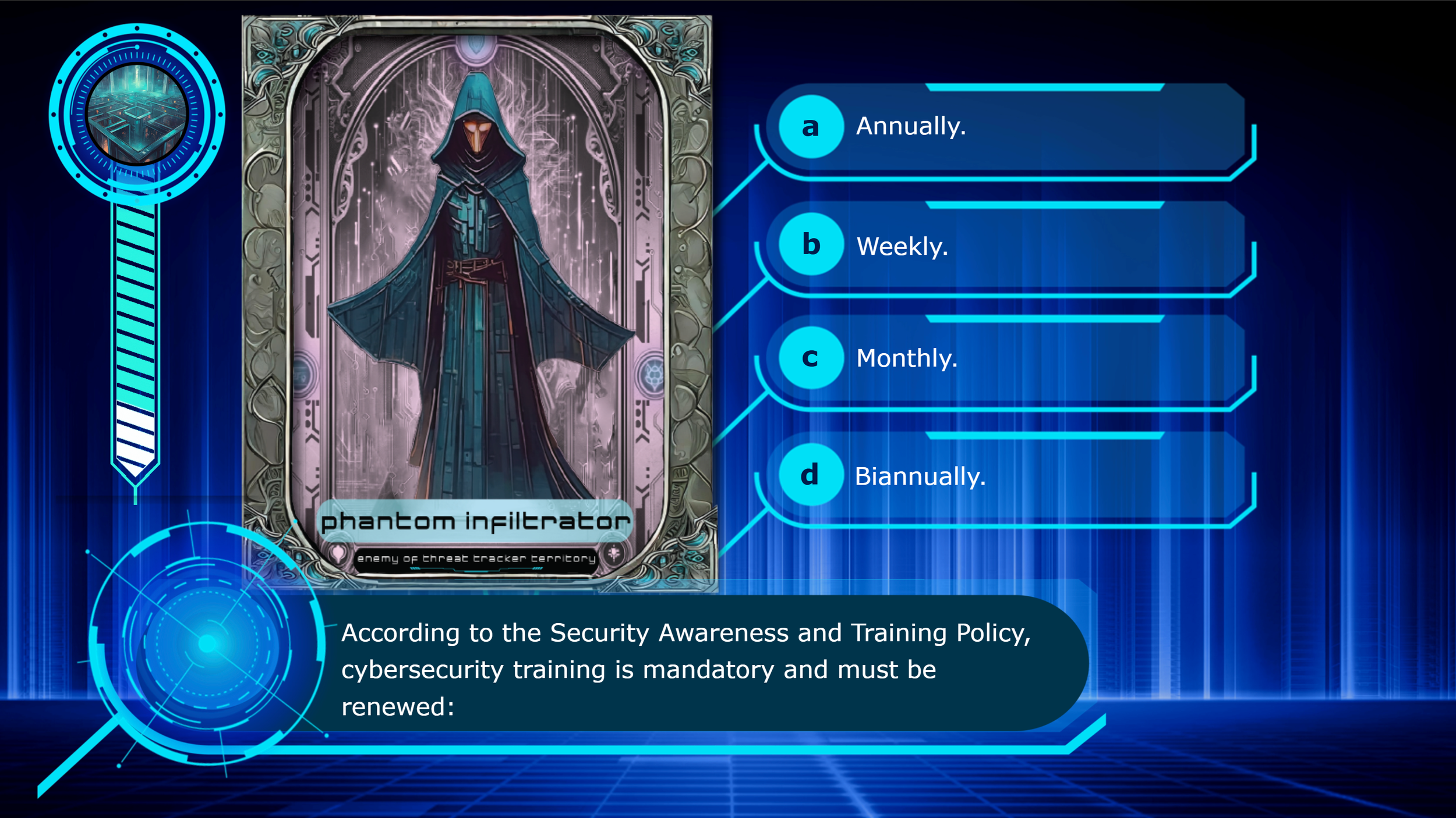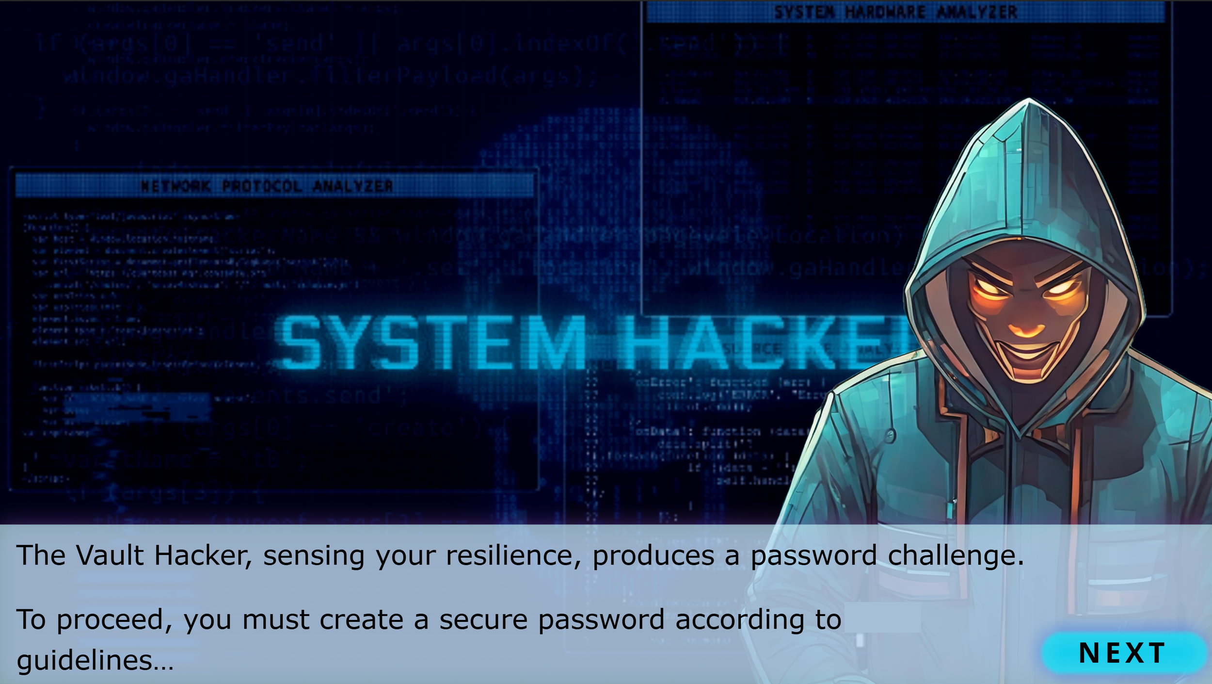 A gamified e-learning experience designed to engage learners in cybersecurity best practices and essential knowledge through interactive challenges and scenario-based gameplay.