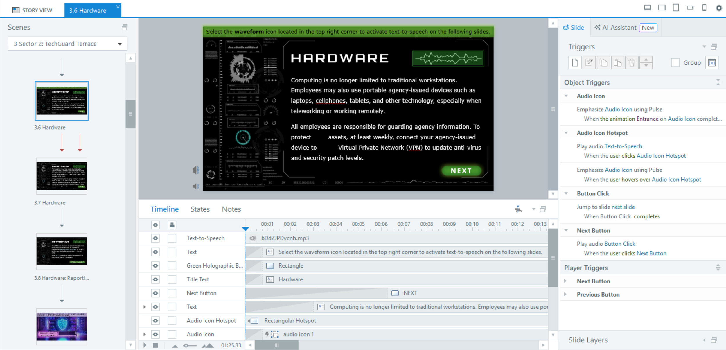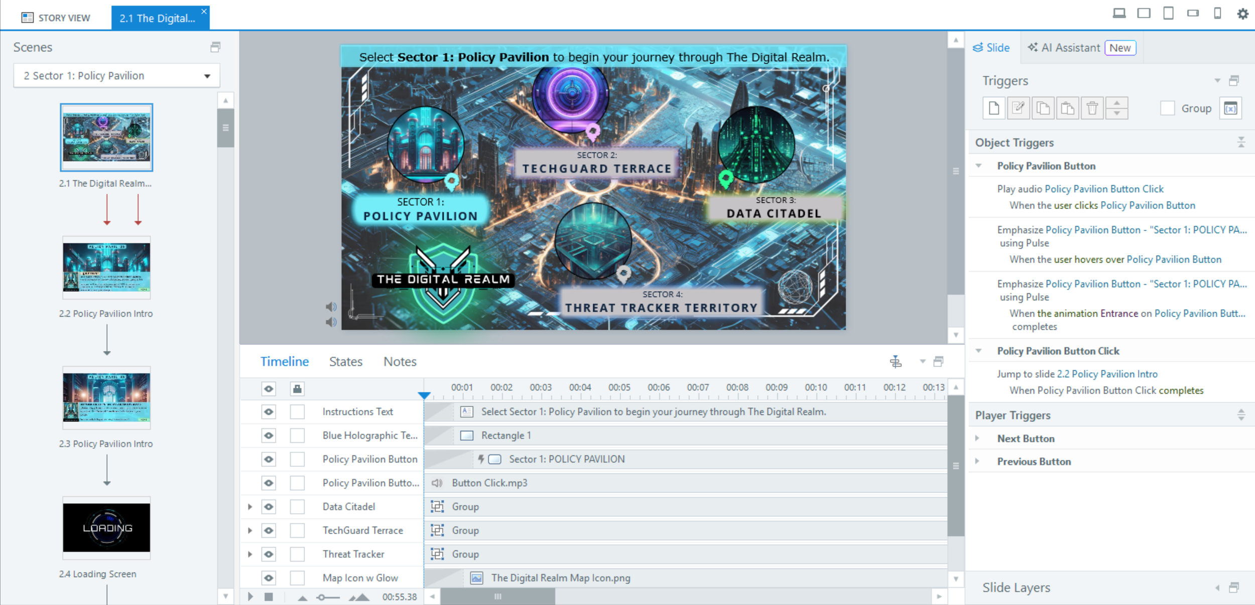 The development phase involved transforming the approved storyboard and visual proposal into a fully interactive, gamified training in Storyline using Adobe Illustrator and Canva. Custom graphics were integrated into Storyline, where triggers, variables, layers, states, and animations were used to create immersive scenarios. Accessibility remained a priority throughout development—I added alt text, customized focus orders, and conducted JAWS screen reader testing to ensure compliance with Section 508 and WCAG standards.