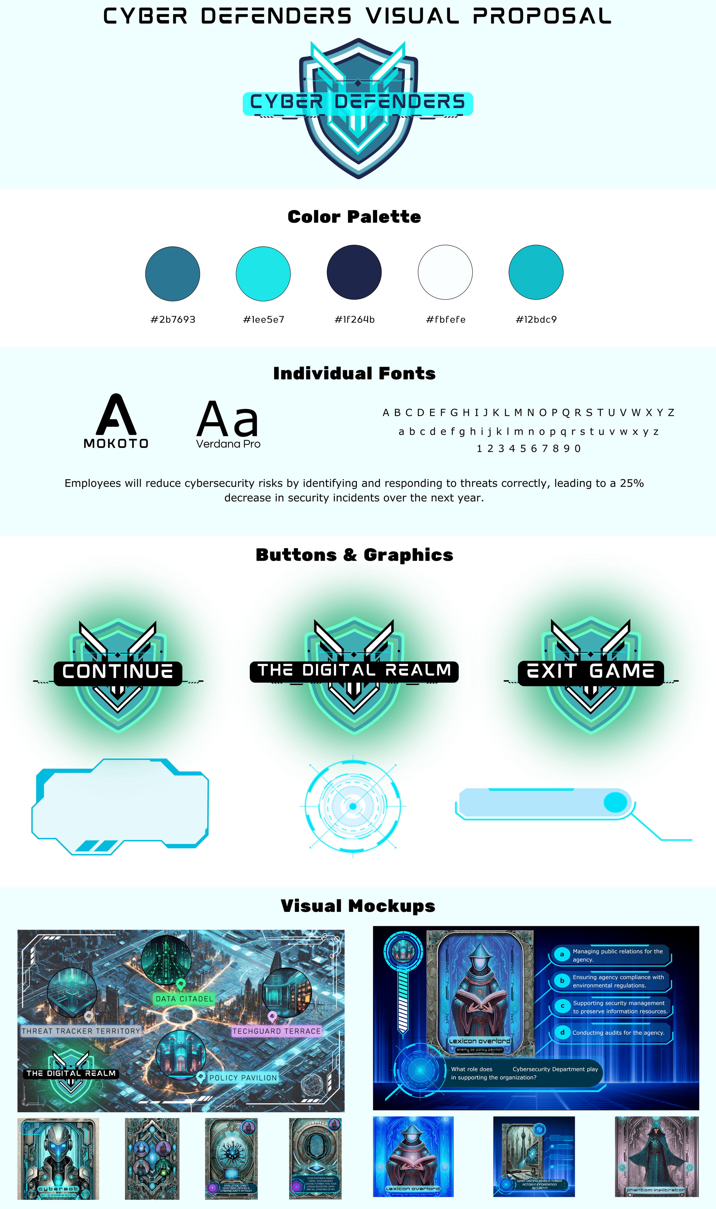 The logo, buttons, and graphics reinforce the cyber-defense narrative, while interactive elements such as the game map along with the character cards and question slides enhance engagement. The selected fonts—Mokoto and Verdana Pro—balance a tech-inspired look with readability.