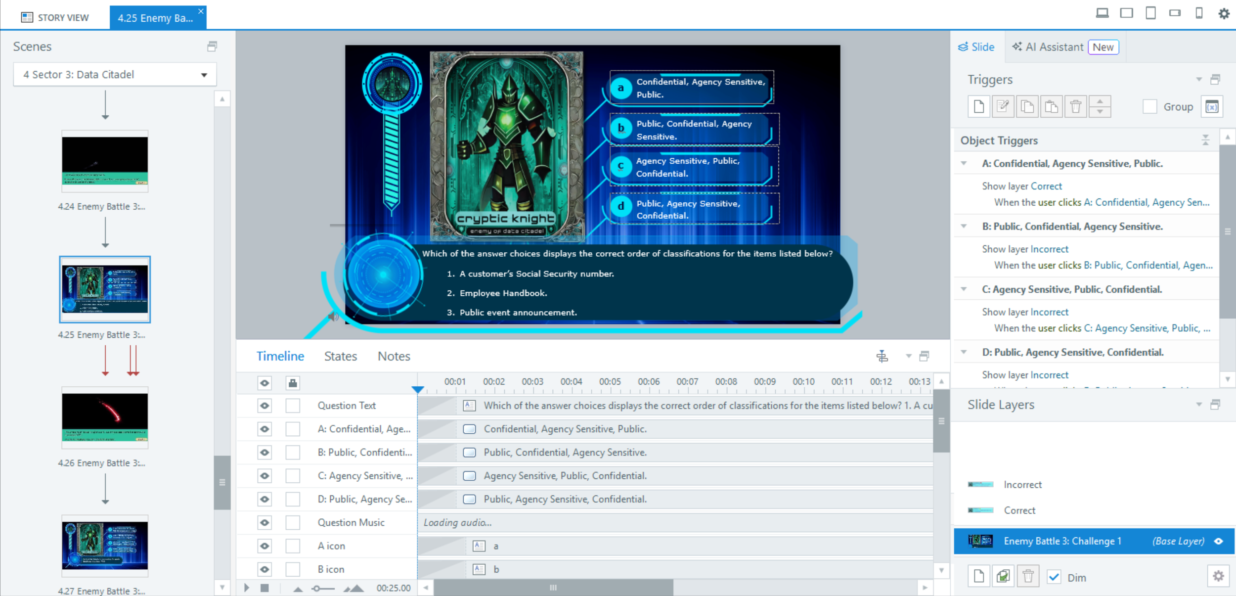 To bring Cyber Defenders to life, I followed the ADDIE model, starting with a thorough analysis phase. I worked with the agency’s cybersecurity team to gather data on phishing attempts and security vulnerabilities, identifying key skill gaps to address in the gamified training. This informed the action map and storyboard, ensuring the content focused on the most critical cybersecurity best practices.